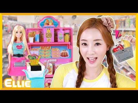 愛麗帶來芭比娃娃超市玩具遊戲。美麗的芭比穿著藍色帶白條紋的T恤和可愛的小粉紅色裙子。她的超市也很美,有購物籃子、商品陳列櫃、更好玩的是還有收銀臺貨物傳送帶,買完東西放在傳送帶上,東西就自然的移動到購物...